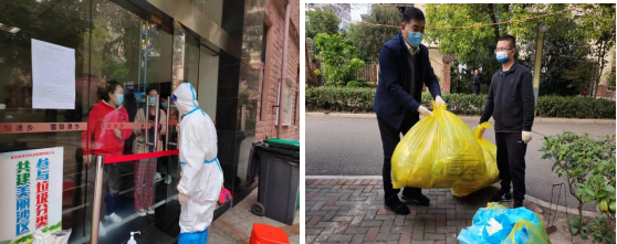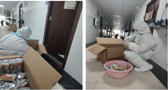 辅导员们为封控管理的19栋宿舍学生分发餐食