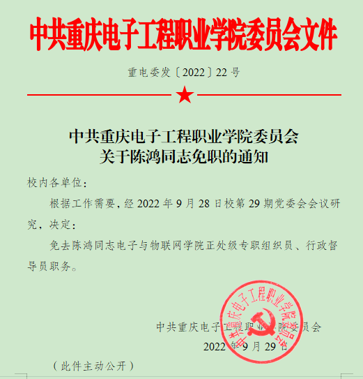 中共重庆电子工程职业学院委员会关于陈鸿同志免职的通知