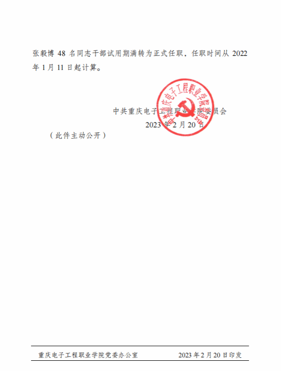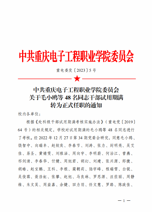 中共重庆电子工程职业学院委员会关于毛小鸥等48名同志干部试用期满转为正式任职的通知