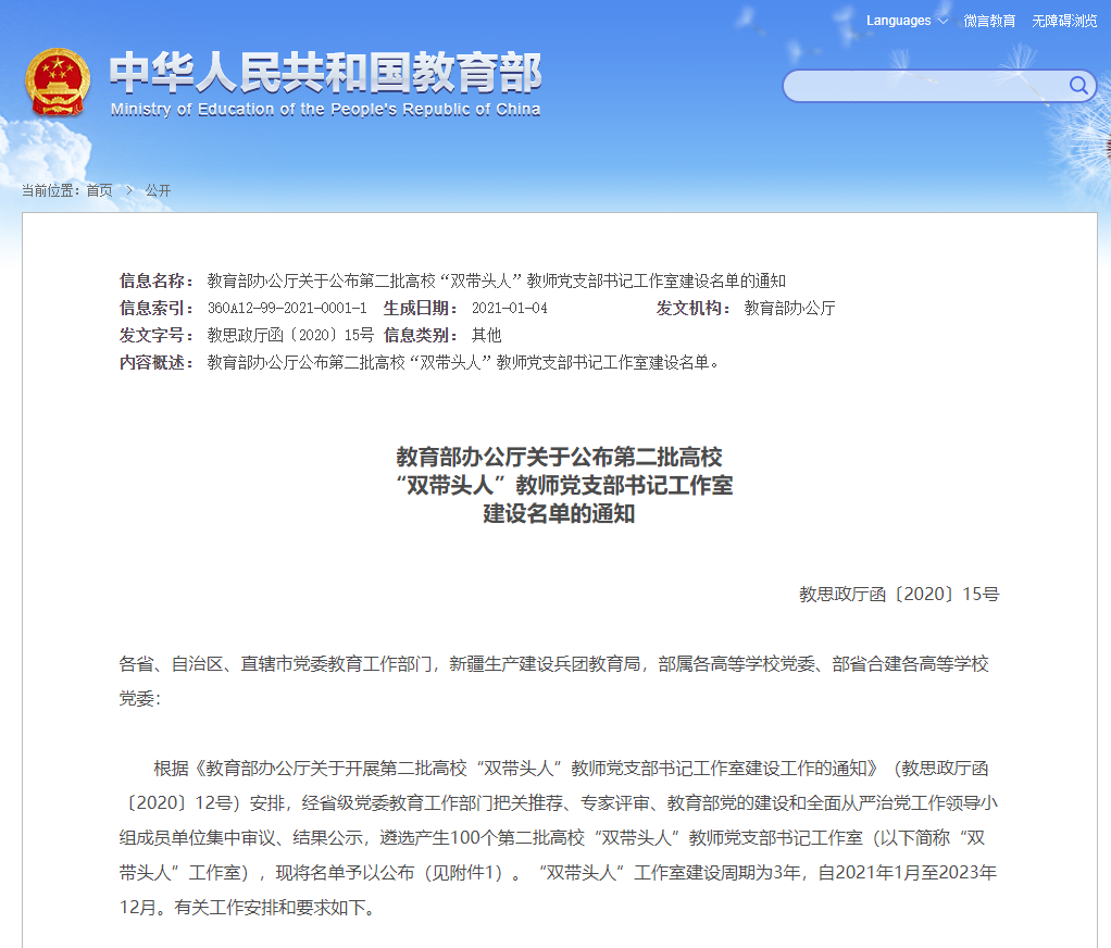 2021年1月4日,教育部办公厅发布了《关于公布第二批高校“双带头人”教师党支部书记工作室建设名单的通知》(教思政厅函〔2020〕15号),遴选产生100个第二批高校“双带头人”教师党支部书记工作室,其中高职院校10个。