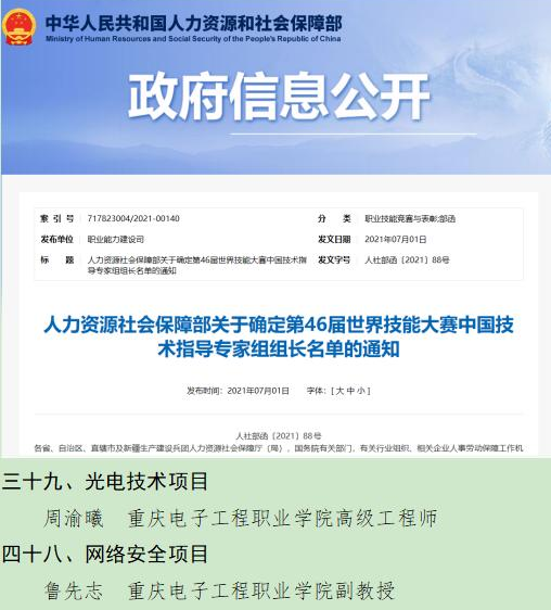 近日,根据据人力资源社会保障部发布的《关于确定第46届世界技能大赛中国技术指导专家组组长名单的通知》,我校党外代表人士周渝曦、鲁先志老师分别成为第46届世界技能大赛“光电技术项目”和“网络安全项目”两个赛项的中国技术指导专家组组长!