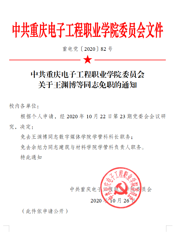 中共重庆电子工程职业学院委员会关于王渊博等同志免职的通知