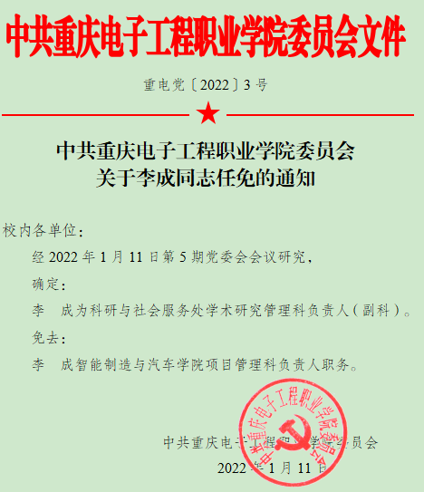 中共重庆电子工程职业学院委员会关于李成同志任免的通知