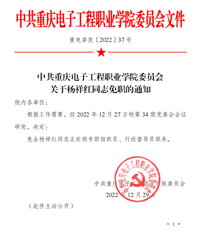 中共重庆电子工程职业学院委员会关于杨祥红同志免职的通知