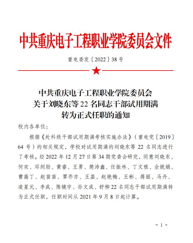 中共重庆电子工程职业学院委员会关于刘晓东等 22 名同志干部试用期满转为正式任职的通知