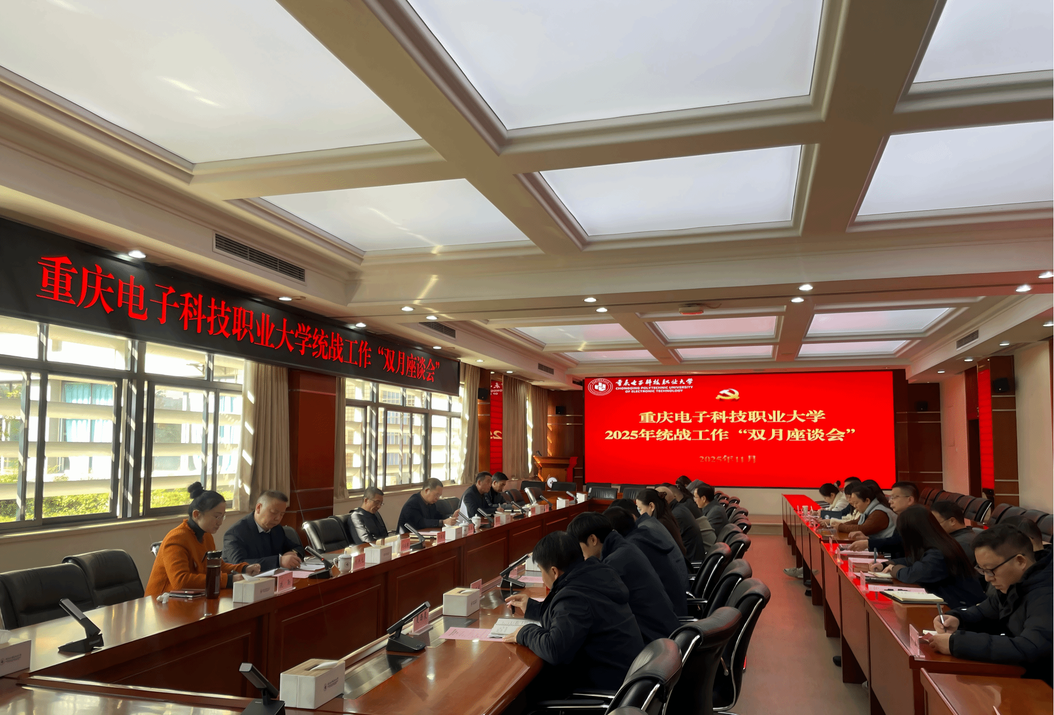 为深入学习贯彻习近平新时代中国特色社会主义思想和党的二十届四中全会精神,全面落实习近平总书记关于做好新时代党的统一战线工作的重要思想,进一步凝聚统战共识、汇聚发展合力,2025年11月20日,我校统战工作“双月座谈会”在博润厅顺利召开。党委书记张伟,党委副书记龚小勇,党委常委、副校长黄爱明、刘洪光、叶勇,党委常委、党委统战部部长疏勤出席会议。各二级学院党总支统战委员、各民主党派和统战团体负责人及党外知识分子代表参加会议。会议由疏勤主持。