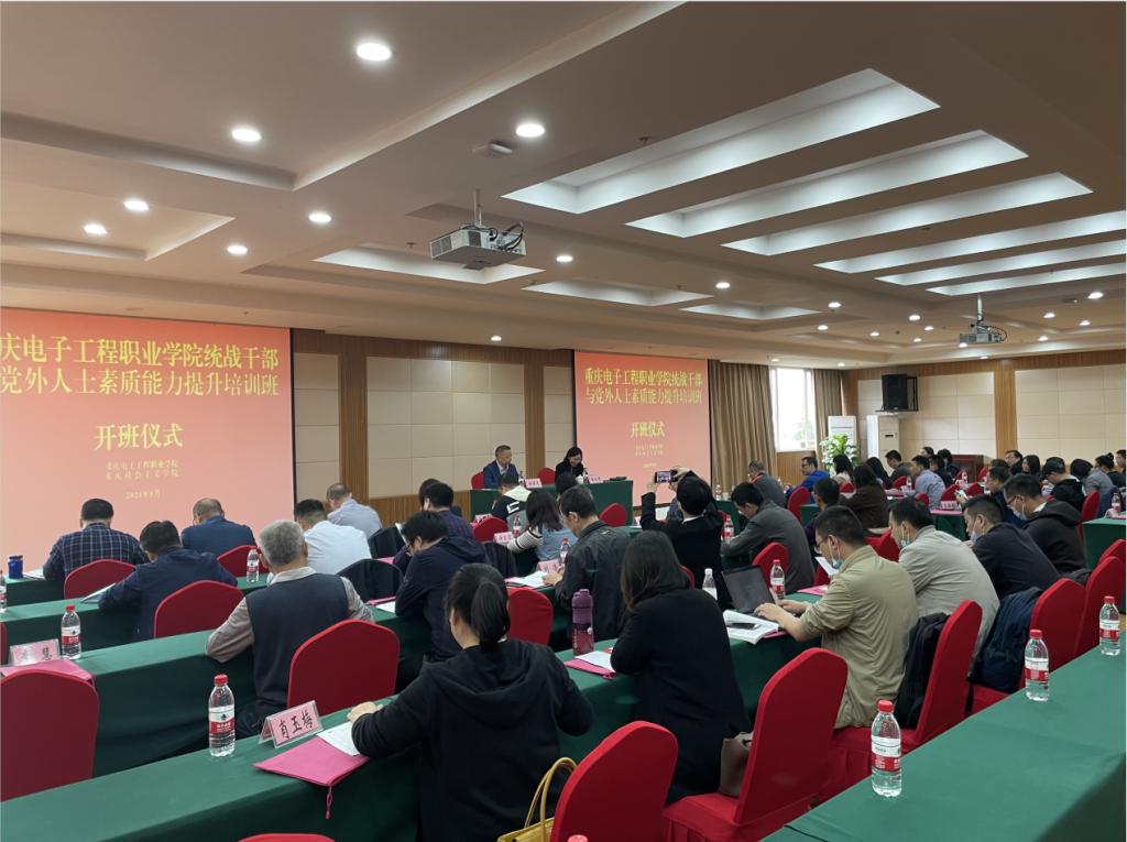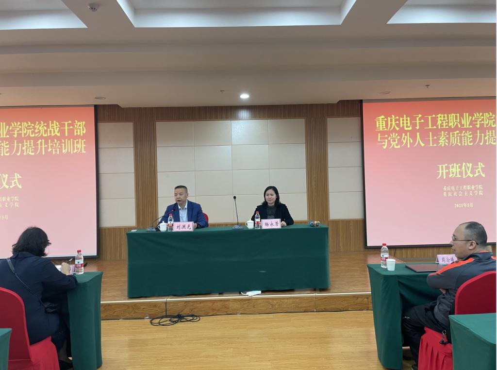2021年5月27日,我校在重庆社会主义学院举办2021年统战干部与党外人士素质能力提升培训班。学校统战干部、民主党派成员、无党派人士、知联会会员和统战部工作人员50余人参加了本次培训。重庆社会主义学院中华文化工作部主任杨永芳出席了开班仪式,开班仪式由重庆电子工程职业学院党委委员、党委组织部部长、党委统战部部长刘洪光主持。