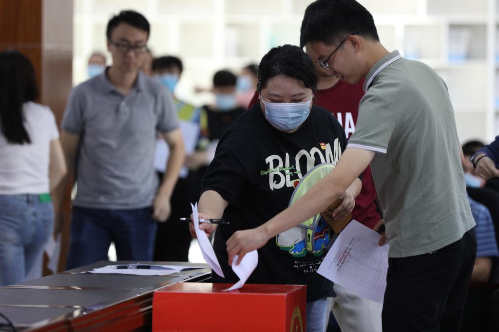 工作人员向参会党员展示并检验票箱,并向全体参会党员发放选票,宣读选票填写说明。全体到会党员认真填写选票,投出庄严神圣的一票。投票结束后,由监票人监督,计票人开箱清点回收选票。